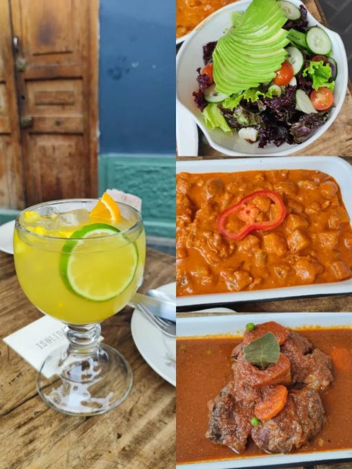 这是我们点的,味道还不错。沙拉,炖牛蹄筋和牛颈肉。旁边那杯就是利马著名的皮斯科酸酒(pisco),我点的是桃子味儿的,味道好极了。就是菜量大了一点儿,造成每样都剩了。这顿饭价格将近160美元。