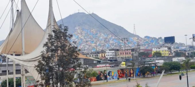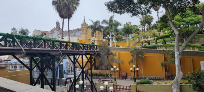今天我介绍一下沿着这个教堂正门的一条街一直往北走,有一个非常漂亮的公园,这个公园叫Museo de Sitio del Parque de la Muralla。从这个公园里面的过街天桥上可以看到对面山上彩色的房子,还有街边大型的壁画。