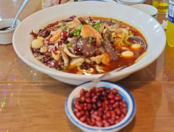 我们去的时候这家餐厅基本都满了。这次我们没有敢多点,看到旁边桌的菜量都很大,就点了一个毛血旺和呛圆白菜,一个酸辣汤。最后证明这种量,两人只能点两个菜。