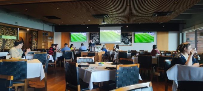 其实我也搞不懂这黑白条是巴西国家队的,还是一个俱乐部的队服。后来回来一查,原来这是一个叫博塔佛戈的俱乐部的衣服。当晚是他们和一个穿红色衣服的球队比赛。我们在餐厅吃饭的时候,正是比赛的时候,餐厅的电视都在播放这场比赛。很多人一边吃一边看一边欢呼或者唉声叹气。
