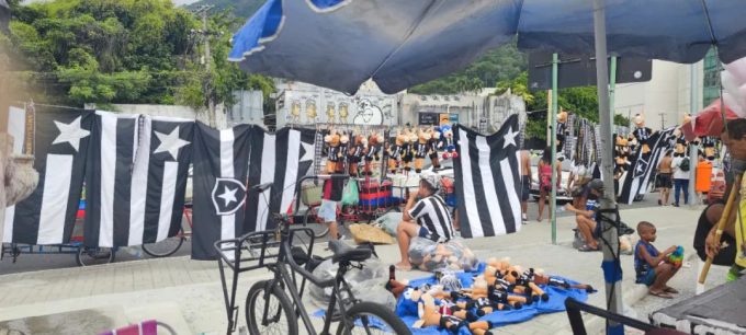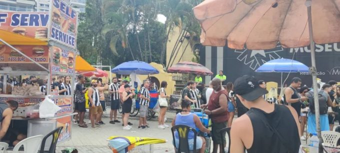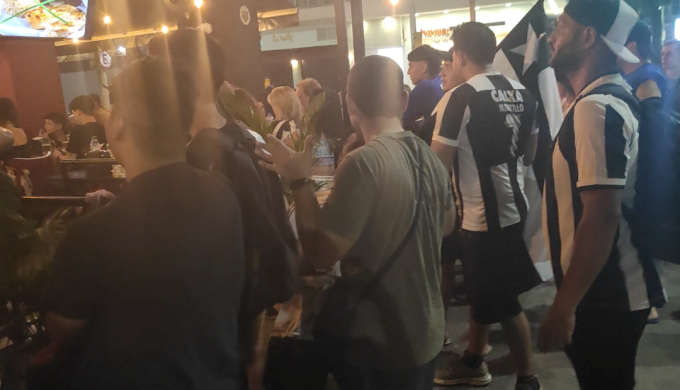 不过在去餐厅的路上,我们听到远处人声鼎沸,音乐声,鼓声响成一片。我们本着遇到热闹绝不能放过的旅游原则,顺着声音就走了过去。结果发现那是一个体育场的门口。门口聚集了很多穿黑白条运动服的人群在排队入场。场外卖着这个队的各种旗子和周边。一打听,原来晚上有巴西足球甲级联赛。