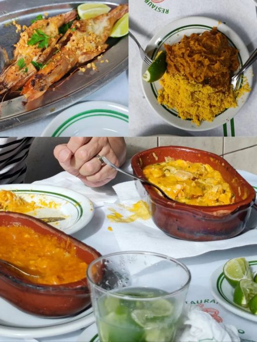 里约是靠海的城市,所以海鲜是他们的主要食物。左上图类似我国的盐焗大虾,虾很新鲜肉稍微有点甜,肉质Q弹。右图,深色的是蟹肉裹着一种咸鲜的酱,不是非常咸。浅色的是巴西著名的配菜主食,玉米和大米混合一起炒熟以后弄成碎末,刚炒出来的带着一种炒玉米香,无任何味道。可以直接吃,也可以用来拌旁边的蟹糊吃。几乎所有餐厅都有这个东西,总是和比较咸的菜搭配。下面两个椭圆形盘里面左边的是土豆泥和番茄一起烤出来的,这个我喜欢吃。右边的是巴西名菜海鲜烩。里面有鱼,虾和鱿鱼。这个菜比较咸,所以是配白米饭吃的。我看旁边桌的两个年轻人,就点了一个海鲜烩,我们点了这么多,只有虾吃完了,还有白水喝光了,其他的都剩了。