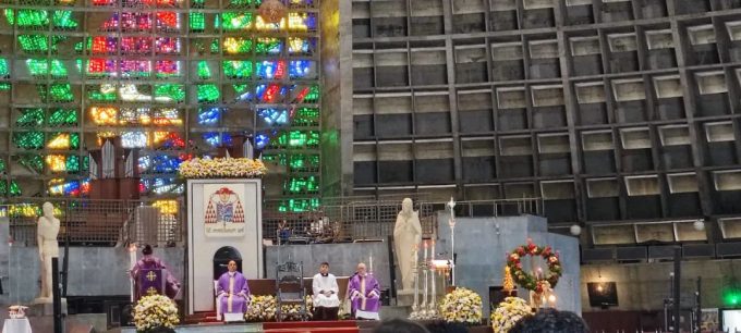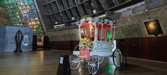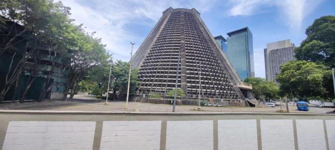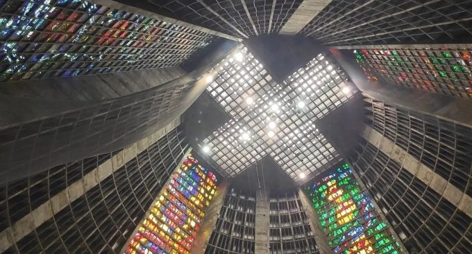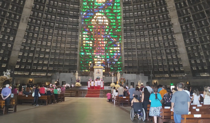 我回来照着我拍的照片在网上查了一下,看到了这样的介绍:里约热内卢圣主教座堂始建于1964年,1976年落成使用,是一处钢筋水泥结构的现代化建筑。教堂呈圆锥形,高75米,底径106米,整个框架结构由规则的方框构成,好像天梯,所以又称做天梯教堂,可容纳2万人。教堂气势恢弘,高大气派。教堂正门前,是教皇保罗二世的铜质塑像,左侧,是和教堂高度相当的钟楼,钟楼上方是十字架。建筑群庄严肃穆,傲立于城市中心,奇特的造型,在现代化的楼群之中显得鹤立鸡群。教堂周围,花木葱茏,环境优雅,绿地面积虽然不大,但是小巧别致,给人以美的感觉。