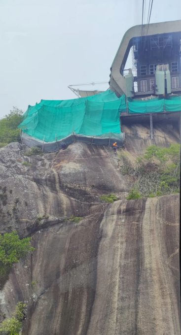 这是我坐上缆车的时候拍的对面我们要去的面包山。感觉完全是一种去一个神秘的地方的感觉,真的是云里雾里的。关键是在这样的天气下,当我们快到面包山的时候,看到居然有人是靠自己身上绑着各种爬山工具爬上来的。估计这样的人玩儿的就是心跳。
