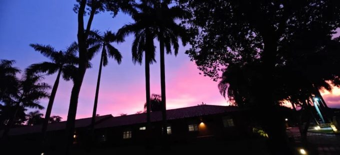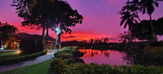 大雨大概在晚上快7点才停,这个期间我们在酒店餐厅吃饭。我们吃完饭经过大堂,看到很多人正在往外走。往外一看雨停了,室外一片粉红色。我们不知道发生了什么,也跟着走了出去。