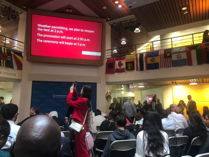 我刚到的那天本来想要去会场看一下情况。结果发现哈佛主校区被封闭不让进入了。我们所有家长和家属都被发了一个手环,每个上面都有一个数字代码。不同学院的数字不同。只有22日在主校区举办毕业典礼的学院才能进入。什么法学院,商学院,肯尼迪学院的都不能进入。