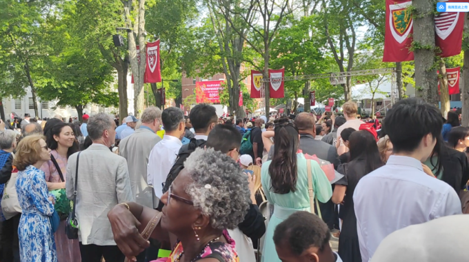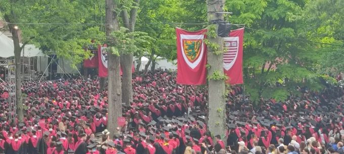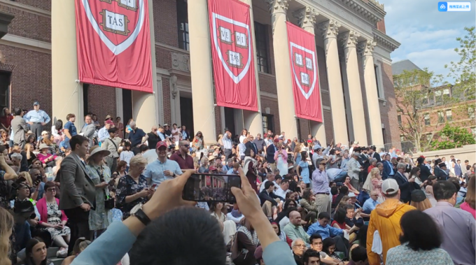 5月23日,是哈佛所有学院的毕业生典礼。会场是在哈佛校园里面。主要以在哈佛图书馆前面的广场为主场,毕业的学生们按照各个学院的标志分区域坐在会场里面。家长和家属都是在会场外围。