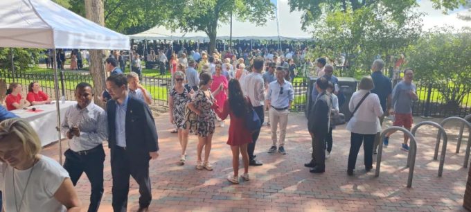最后我们只能站到这个著名的哈佛图书馆最高一层的台阶上了。听站在我旁边的一个华人家长说:很多印度、中东的家长们都是早上5点就过来占地儿了。我们华人还觉得自己已经够卷了,结果来了才知道还有其他国家的人比我们更卷。我听了这话,庆幸自己没有9点才来。否则可能只能站在校门外了。