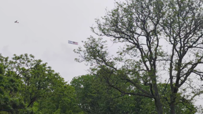 从典礼开始前到整个过程中,空中一直有两架飞机拉着横幅在会场上空盘旋。一架拉着美国和以色列国旗,一架拉着一个支持以色列口号的横幅。
