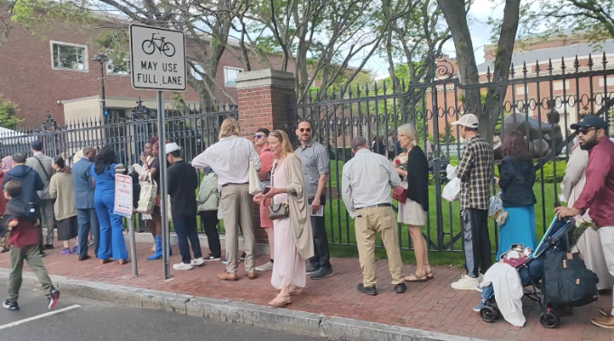然后我们就看到家长们的长队。我们一看如果要排这个队一个小时也到不了主会场。我因为之前来过哈佛几次,知道还有几个门可以进入。就拉着女儿室友的父母赶快继续往前走。