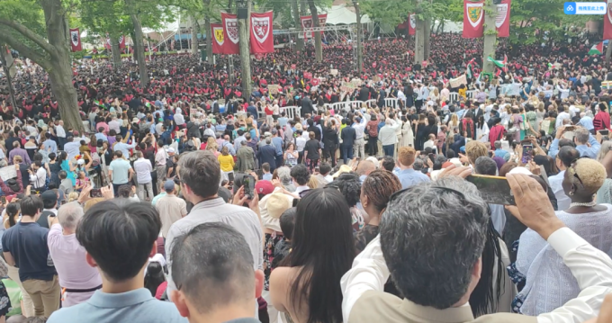 在典礼上当一个学生代表讲完话以后,场上左边学生坐的地方突然一大群学生拉着标语横幅站了起来,然后全场各个学院的位置上都有学生跑出来加入。领头的人举着巴勒斯坦的国旗。他们的口号声音压过了学校台上的人讲话的声音。以至于我们站在图书馆高层位置的人,根本听不清广播里面说的是什么,也听不清学生们喊的口号是什么。大家都莫名其妙地站起来看下面发生了什么事情。