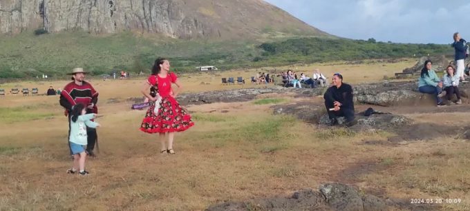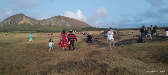 拍完摩艾,我扭头一看,看到了远处有一个小火山,并看到了一对夫妻穿着传统服装带着孩子来拍照。同时也看到原来我们周围居然有这么多人和我们一样早早出来拍日出映照的摩艾。