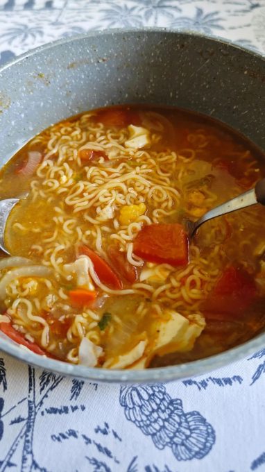 大家可以体会一下,在这个孤岛上,被雨断断续续地淋了一天。回来能够吃上一碗这样热乎乎的方便面,是多么幸福的事情呀。