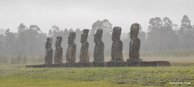 就在我们去第二个景点Ahu Akivi的路上,突然一大片乌云遮盖了太阳并下起了大雨。幸亏我们的导游带了雨伞,我们俩就撑着一把雨伞进入景区,给这7位在大雨中依然昂首站立的摩艾们拍了一个他们淋浴照。