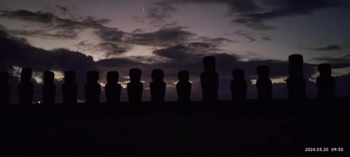 这是当地时间早上8点,太阳刚刚升起。摩艾的影子渐渐清晰,甚至可以看到谁戴着帽子了。