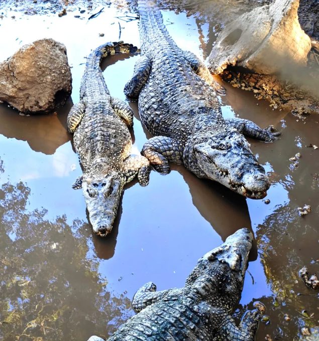 鳄鱼滩就在回程的路上。也算是一个小型的自然动物园吧。而这个公园里面最大的就是鳄鱼滩。滩上躺着很多懒洋洋的大小鳄鱼,有几十条在晒太阳,水里还有多少不知道。为了安全,公园管理用很高的铁丝网把鳄鱼滩围起来。为了让游客喂养鳄鱼,他们特地搭了一个木桥。