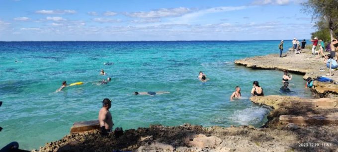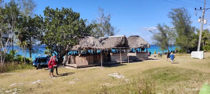 我们最后一天是去位于古巴南部的一个叫猪湾的地方和鳄鱼滩,导游介绍这里有一个很著名的尚未开发的加勒比海海滩。海水清澈见底,有很多非常美丽的鱼,很多人都来这里潜水,和鱼一起游泳。靠近岸边很浅的地方,撒一些面包屑,各种颜色的鱼就会游过来一抢而空。大家可以在这里潜水或者游泳,和大自然中的鱼亲密接触拍照。中午在距离这里不远有一个农家饭一条街,在这条街上有很多主推当地农家饭的餐厅。导游说,大家来了这几天,整天在度假村餐厅也吃腻了,所以带着大家来品尝一下这里当地人评价不错的农家餐。