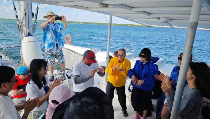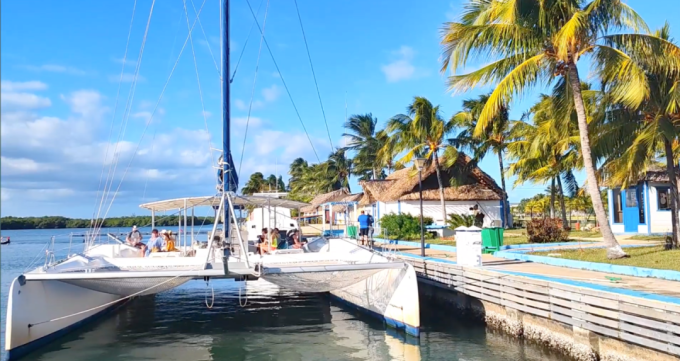 中午吃饭时间,大概又有4,5艘船停靠在这里。海滩上到处都是晒太阳和戏水的人。饭后餐厅里面放起了音乐,一个服务人员带着坐在餐厅里面休息的认识的和不认识的都手拉着手,一起欢乐地跟着音乐跳起了舞。