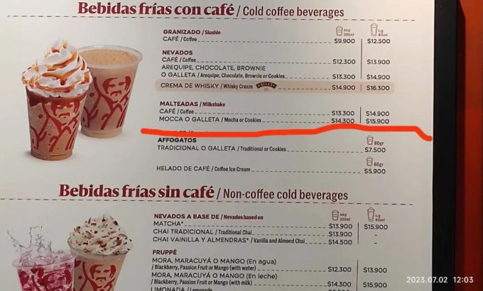 这是哥伦比亚国民咖啡店胡安咖啡的价格。折合人民币的话感觉和星巴克或者tims 差不多。这个咖啡价格兑换加币与加拿大国民咖啡tim hortons 差不多。