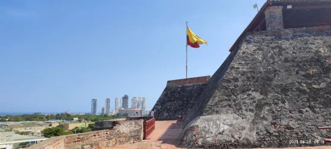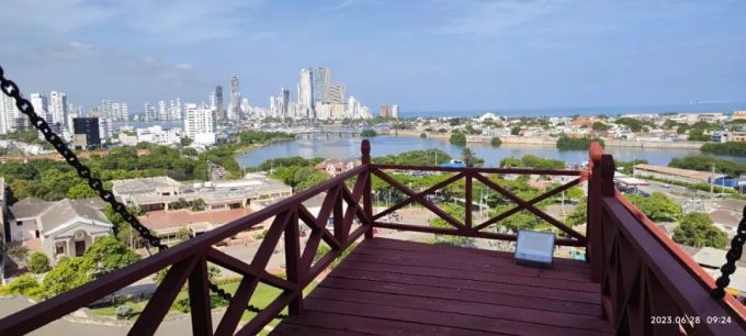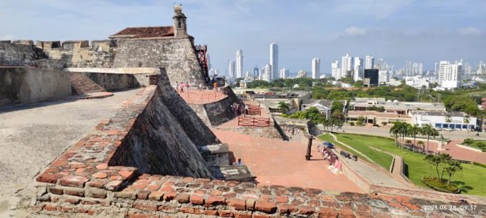 站在这里(上图)可以看到远处左边是卡塔赫纳高楼林立的现代化新城。右边一片红屋顶的地方就是老城区。远处的大海是加勒比海。