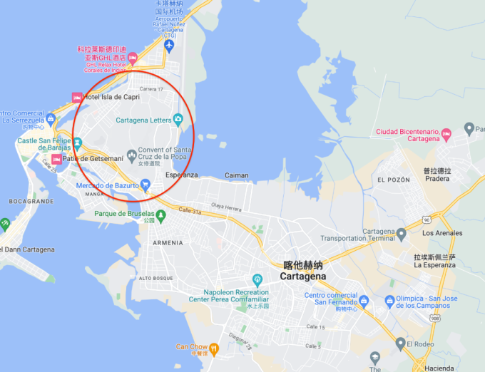 卡塔赫纳这个城市不大,主要分为两部分,一部分就是拥有世界历史文化遗产之称的老城(寨城)位于西部,一个就是拥有现代化时代感的新城位于东部。而主要旅游资源都在老城周围(如上图红圈里面的位置)。机场也是距离老城很近,开车大概需要15~20分钟就到了。