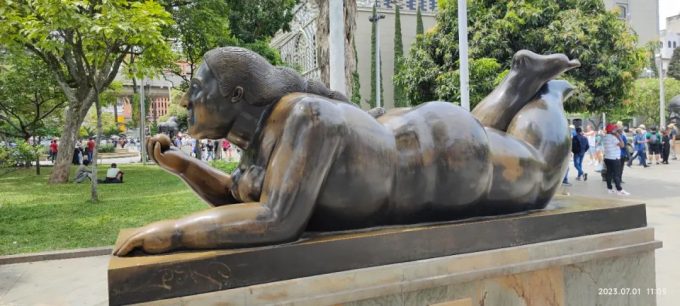 我们第一天上午先去了市中心的博特罗广场,这是以出生在麦德林的哥伦比亚著名艺术家费尔南多.博特罗的名字命名的广场。广场上竖立了23座他的铜雕作品。他的作品不论是动物还是人物,都是以胖乎乎的形象来体现的。其实在卡塔赫纳我们就和他的作品见过面也合过影了。我2018年的游记里面放过一个在卡塔赫纳老城的胖女人的铜雕塑。