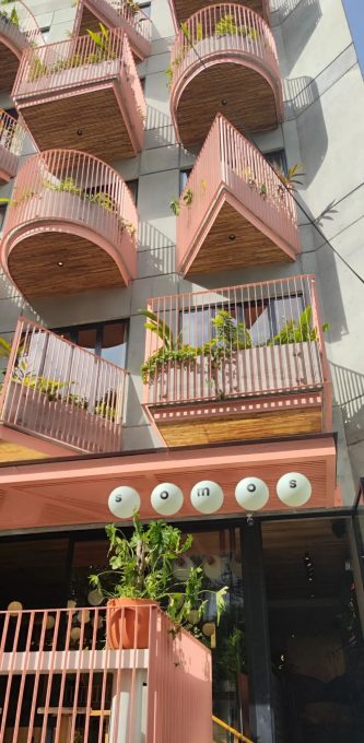 因为逛了一天感觉累了。晚上没有去酒吧街,直接回到了我们这个粉红色造型新潮的酒店想要早点休息。第二天还要继续旅游。