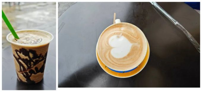 左边是冰咖啡,他们是先把巧克力酱从杯子里面挤在杯子壁上,然后再把咖啡冰沙灌入杯中。这样看上去杯子壁都是花纹,很好看。喝的时候,需要搅拌让巧克力和咖啡融合。味道好极了。右边是传统的热摩卡。