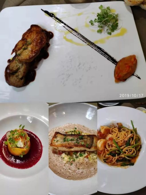 上图是红酒鹅肝,配波罗面包。下图分别是:沙拉,香煎鳕鱼,海鲜番茄意面。