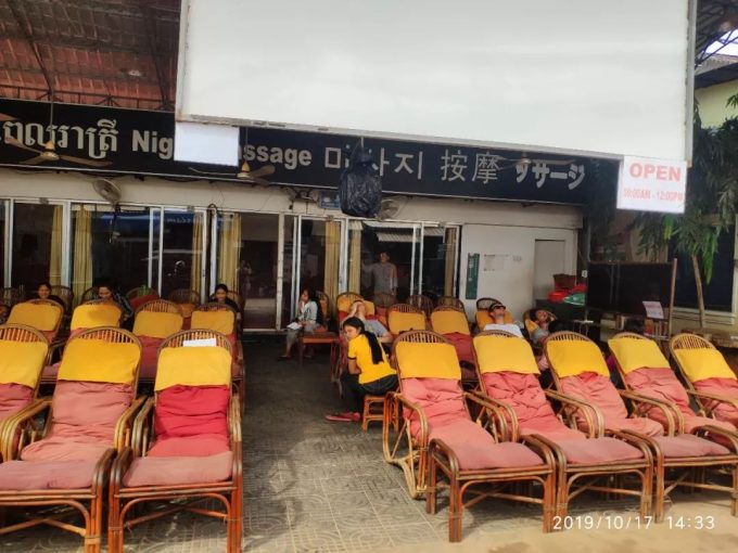 我来的时候很多朋友对我说,一定要去做一次按摩。我们因为之前旅游马不停蹄的跑了两天,确实感觉腿酸脚疼,就决定选择了足底按摩。我们去的时候按摩的价格是:足底按摩一次半小时1~3美元。上图这个是1美元半小时。因为当时天气太闷热,我们选择了一个有空调的屋内按摩,价格是3美元半小时。感觉确实不错。推荐大家到暹粒的时候可以做一个著名的足底“马杀鸡”。