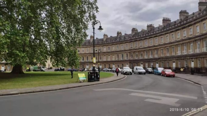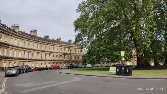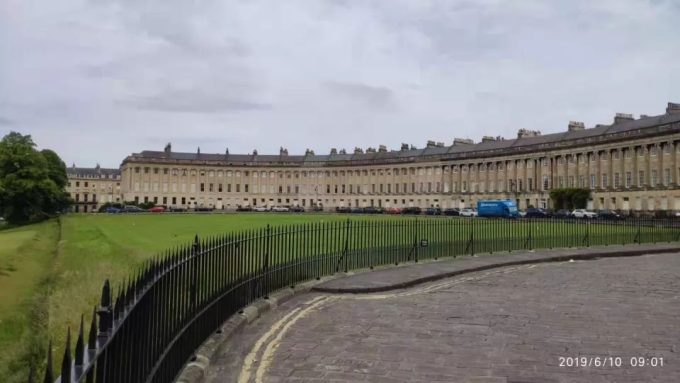 我去新月楼的路上先看到街道两边都是这样半环形的楼群。我开始以为这个就是所谓的皇家新月楼,拿着手机一通猛拍。左边拍完,拍右边,拍完了本打算离开,抬头一看路标原来皇家新月楼还要往前走1000米。