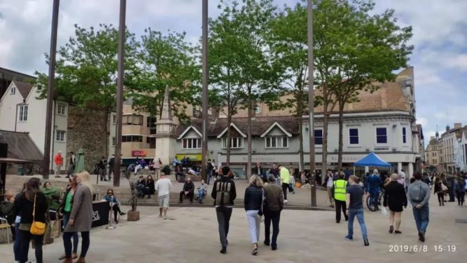 因为这样变化无常的天气造成这里的人穿什么的都有。上图是牛津主要步行街的一个小广场。有穿短袖,短裤拖鞋的,还有穿羽绒服和大衣的。