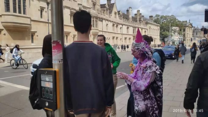 在去往牛津大学的路上遇到一群刚庆祝完生日的年轻人。这个女孩子满身蛋糕很高兴的走在路上,一副舍不得洗的留恋样子。