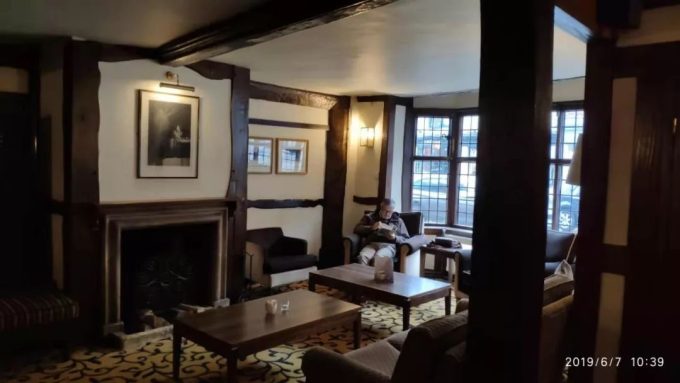上面两张图是酒店大堂里面。 这个酒店大堂一进去给人的感觉就是昏暗的。没有现代化酒店的通体透亮的那种大吊灯,而是被各种各样的光线似乎不足的黄色小壁灯笼罩着。 让我想到的是:是不是当年莎士比亚就住是在这样昏暗的灯光下,写出了那么多悲剧,灯光太亮,容易找不到悲剧的压抑感觉? 反正我一进去似乎有了种压抑的感觉,入戏比较快。