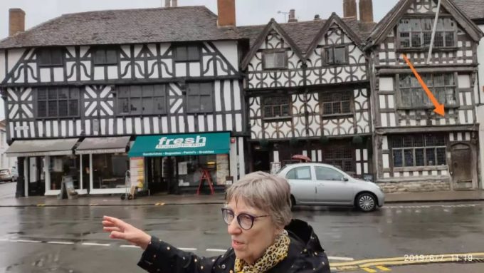 这是17世纪建的当时最贵的房子,看看上边写的老银行,就知道确实很贵。而坐在银行门上的也是莎士比亚。所以不用怀疑,猜都能猜到,莎士比亚属于小镇上的贵族。因为两个最贵的建筑上面都有他,无疑:他只为贵族代言!