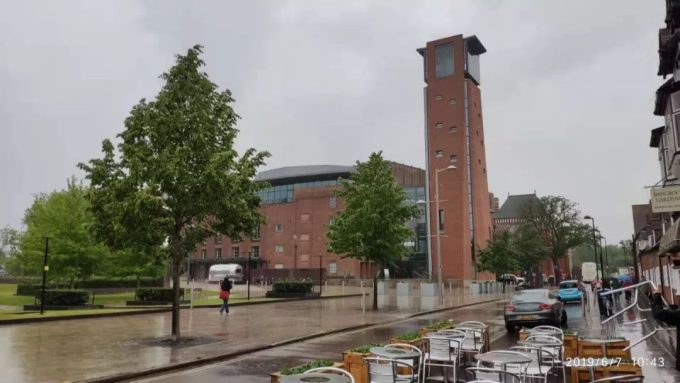 我们躲雨的这个红色的建筑就是这个小镇上景点之一的莎士比亚剧院。这个建筑有两部分组成,前边部分是现代建筑,后面部分是莎士比亚活着时代的建筑。每年3月到10月有莎士比亚戏剧节,所以在这个期间会有很多莎士比亚戏剧在这个剧院里面上演。不过我们去的那天没有。所以就在剧院里面转了一圈也是为了等我们的导游。