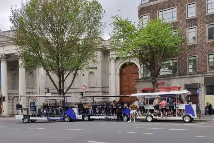 这是一个马路上游动音乐酒吧。其实是一个10多人一起骑才能动的大自行车。我们后来看到参加婚礼的年轻人出来以后,一群男性和一群女性分别骑了两个这样的酒吧车,在马路上一边放着音乐唱着歌,一边喝酒,一边一起骑着这个大自行车狂奔。感觉特别好玩儿。