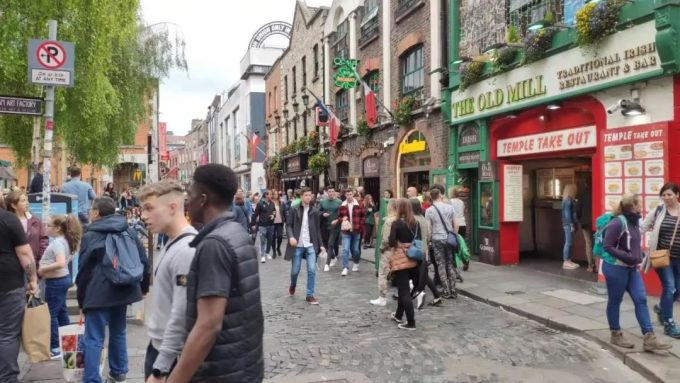 这是都柏林老城区著名的酒吧街。一到晚上特别热闹。到处都是爱尔兰音乐和舞蹈。这里都是小酒吧,几乎所有酒吧都是放着爱尔兰舞曲。不知道大家是否知道有一个爱尔兰特别著名的叫《大河之舞》的踢踏舞团来过中国表演。他们使用的音乐就是典型的爱尔兰传统音乐。