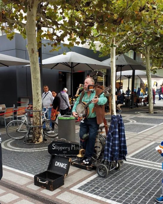 我为什么用“似乎是”来形容这个卖艺的呢?因为你看他口里吹着口琴。手里拿着一个弹拨乐器,双脚一个是鼓锤,一个是扬声器。就这几个乐器凑在一起,完全可以演奏出各种美妙的乐曲。然而,他的这些乐器都不出声!!只有口琴发出难听单调的声音。看上去他在认真的演奏,但是真的没有音乐什么事儿。所有人都是站在他面前看一会儿,然后都莫名其妙的离开了。不过他旁边立着一个盒子上写着slippery Mike (狡猾的麦克)。也许是行为艺术吧。