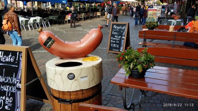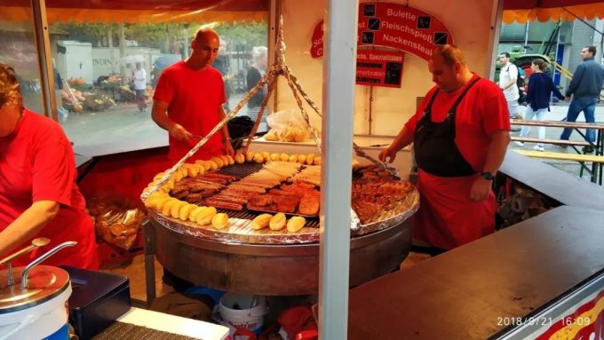 我们去的时候是周五,正赶上他们的周末集市,整个广场都是各种德国式大排档。当天刚下完雨,很冷。所以在照片里面可以看到有人穿羽绒服。当然也有体内热量多或者正在干活的人穿短袖。
