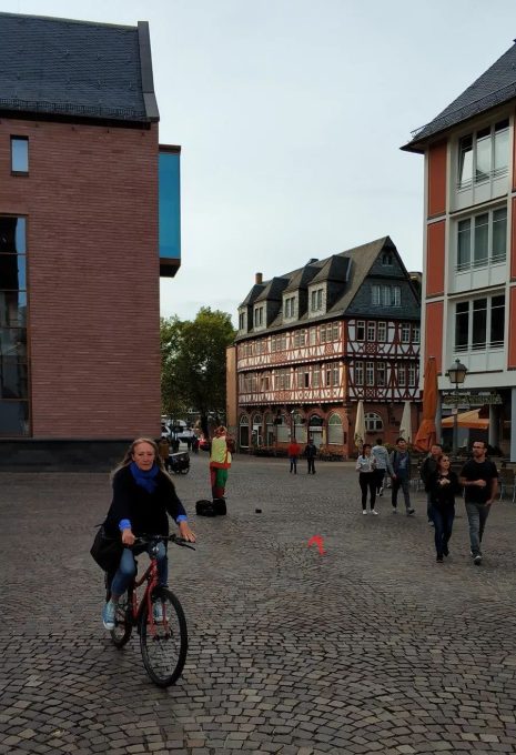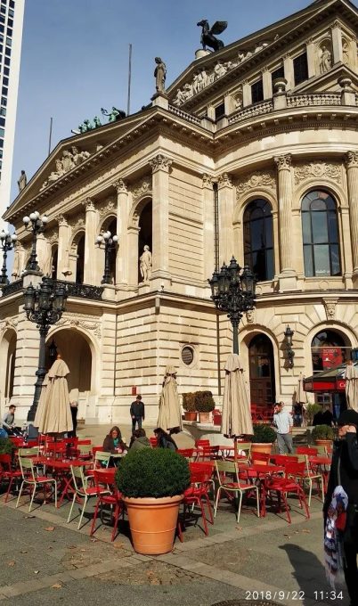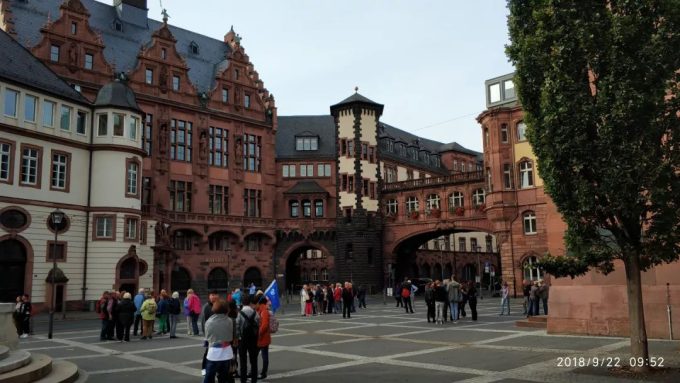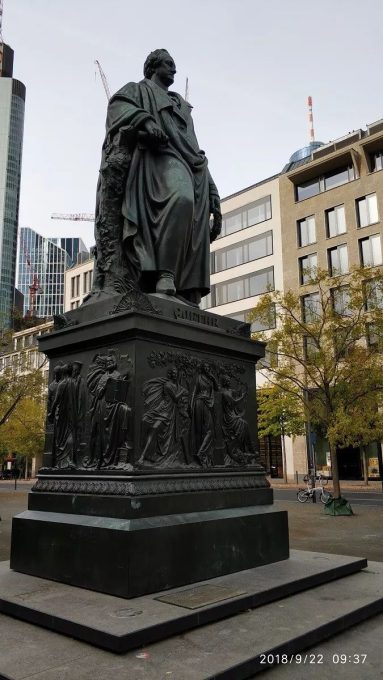 我们经过的第一个景点是有歌德雕塑竖立的歌德广场。歌德出生在法兰克福,所以这里有他的故居。我们去的太早,还没有开门。因为我对他不是很感兴趣,所以对参观他的故居也兴趣不大。他的《少年维特之烦恼》在我上初中的时代很多女同学都看过。我当年作为不学无术的街头战斗型少女,对这种在我眼里属于唧唧歪歪的内容根本看不下去。所以至今都不知道里面写的是什么,到现在我都觉得可能属于德国男版琼瑶文。(文青们不要打我。。。。。。)