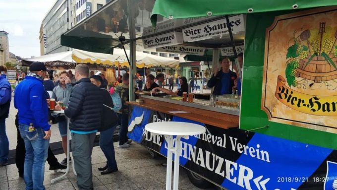 在德国这种集市里面必须有喝酒的地方。这里有喝啤酒和喝葡萄酒的摊子。但是画风完全不同,大有阳春白雪和下里巴人的区别。我不标注,大家也一目了然,哪个摊子是喝啤酒的,哪个是喝葡萄酒的。