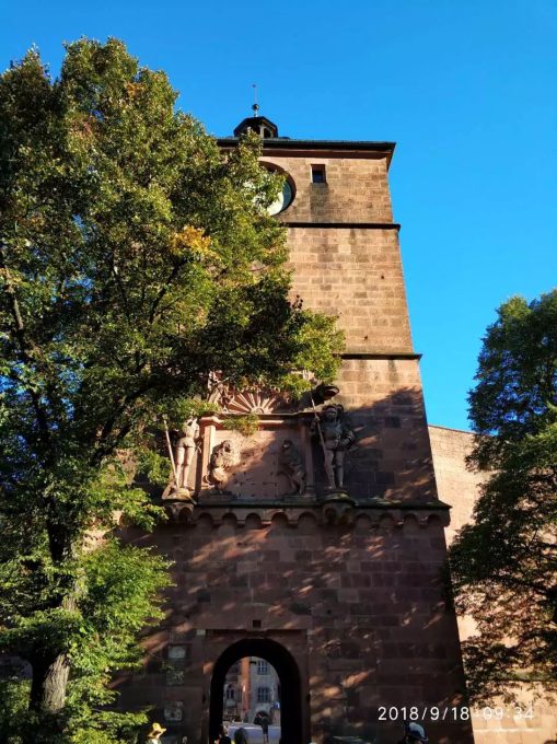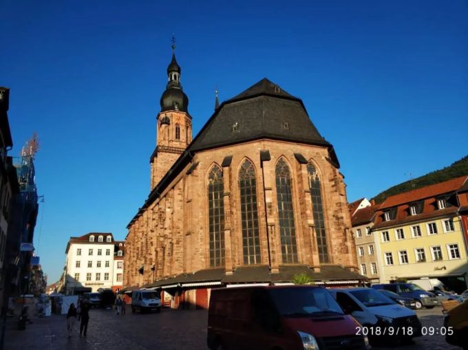 这是早上我们去古堡的路上经过的海德堡著名景点,教堂广场。这个时候广场人很少。上图是早上9点的阳光照在教堂上的样子。