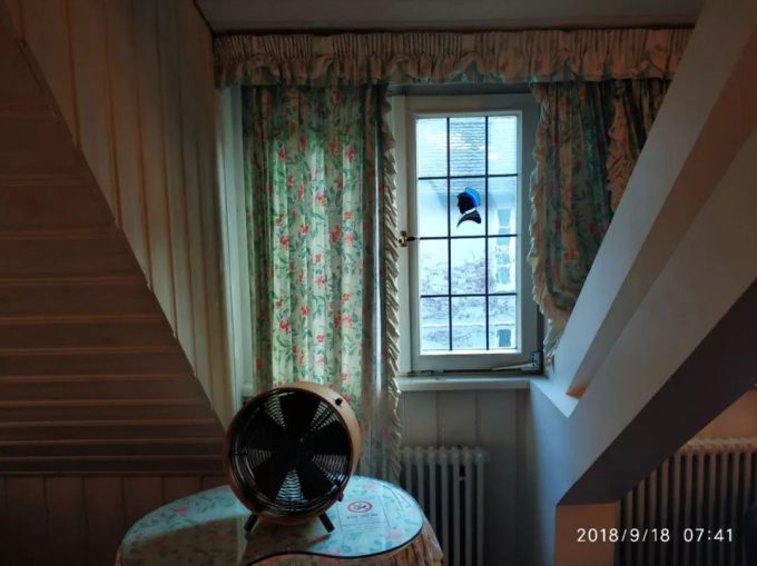 卧室里面古老的电扇和窗户上贴的带有海德堡大学击剑兄弟会剪影的窗花,以及古老的梳妆台上放的一个老掉牙的收音机,这些细节都是在告诉你,这是一个很古老的有历史、有故事的酒店的信息。