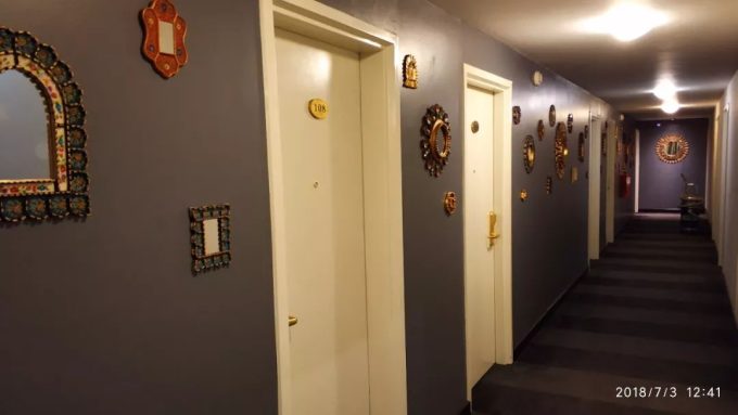 这是墙上挂着很多像白雪公主童话里面的“魔镜”的客房走道。