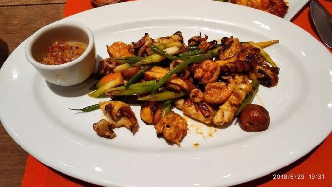 这是茶茶点的,超级好吃,不知道叫什么名字,反正是八爪鱼就对了。特别鲜嫩。我在国内吃的八爪鱼都感觉比较老或者叫韧。这里的八爪鱼有一种入口即化的感觉,非常好吃,所以我也点了另外一种做法的混合炒海鲜,里面也有八爪鱼。也非常好吃。下图是我的菜。