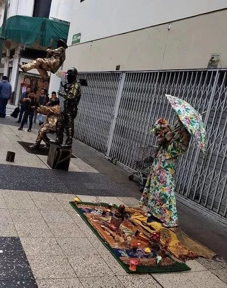 上边照片里面女性后面那个化妆成铜像士兵的难度很高。下面那个人简直像中国杂技里面的大力士直臂举着那个杆子。上边那个人爬在杆上还要不停的变换姿势。感觉他们挣钱很辛苦。这个穿花衣服打花伞的女人,保持这个姿势,一动不动。除非你要买她的东西。