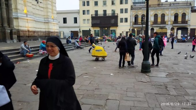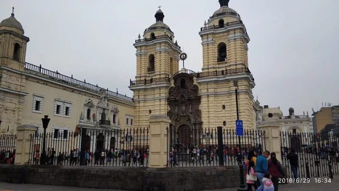 下午我们去了大家在百度上搜秘鲁首都利马会出现一大堆教堂照片的地方。其实我觉得这样的教堂,广场和建筑,基本都是西班牙统治时期建造的,和欧洲典型的罗马式或者什么哥特式没有什么区别。在南美被西班牙统治时期,到处都是他们修的这种广场和教堂。哥伦比亚的各个城市和秘鲁的各个城市都有。所以对我来说没有什么吸引力。我来这里纯属给自己的脑子里面刻一个:鄙人到此一游