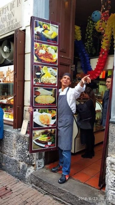 这是我们跟着导游在老城走,导游介绍哥伦比亚传统食物的时候,一个餐厅的招待站在我们旁边,导游说什么食物,他就拿手在他举的图片上点。导游说这个餐厅的传统食物做的不错。所以我后来自己一个人的时候,就跑来品尝了。