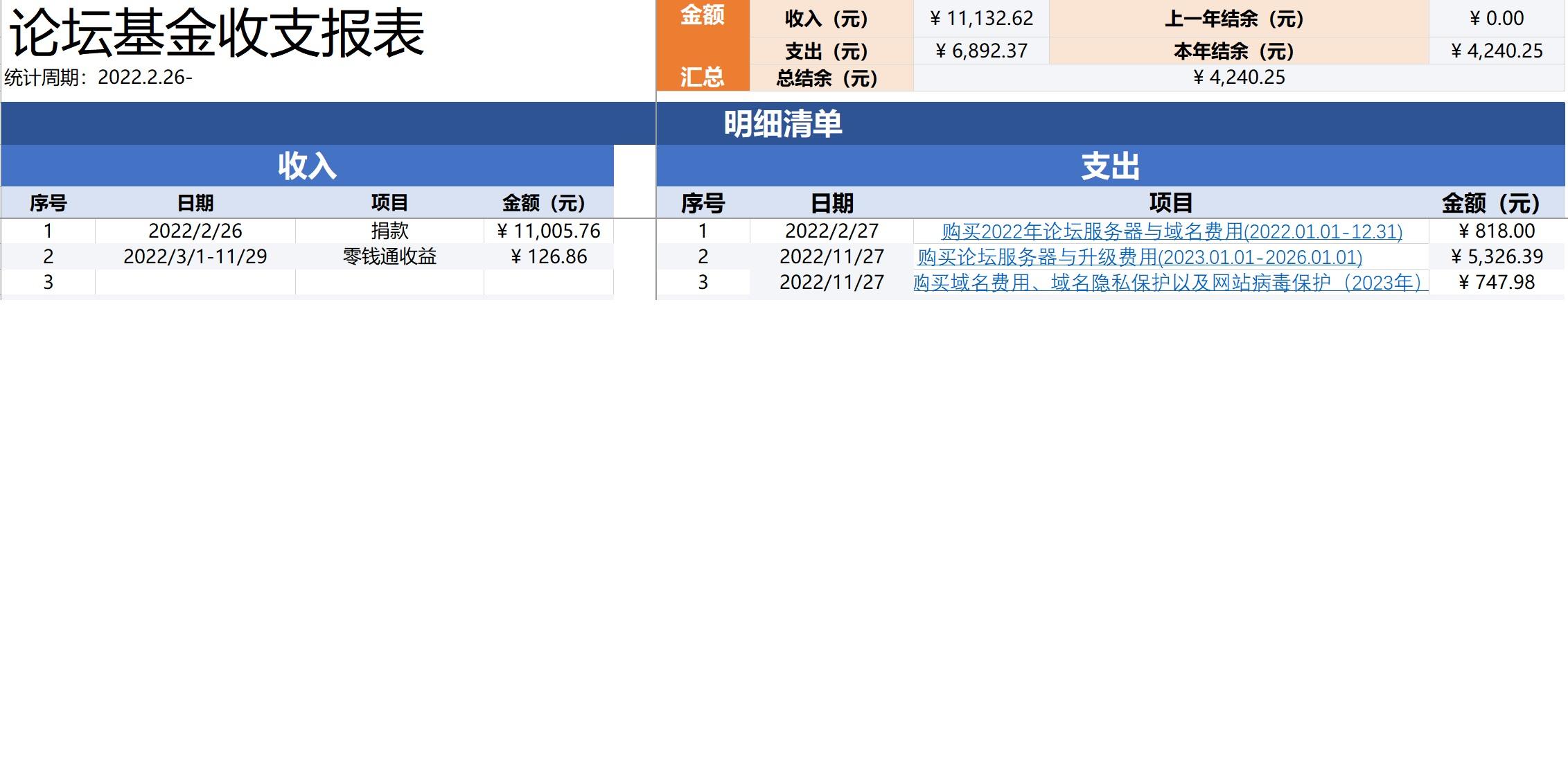 论坛于2022年2月26日第一次筹集资金共11005.76元,今年的服务器与域名费用818元,截至2月27日,余额是10187.76元。后续如有使用和支出变动,也将在此公布与更新,谢谢大家的信任与支持!